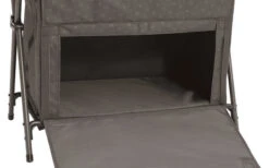 Praktisch, leicht aufzubauender Schrank mit einem Aluminiumgestänge, welches für hervorragende Stabilität sorgt. Die robuste, herunterklappbare Tür mit Griff bietet einen geräuscharmen nutzbaren Stauraum wie zu Hause. In der Tür ist ein Magnetverschluss eingearbeitet. Der Schrank beinhaltet zwei große Fächer, wo Sie ihre Utensilien unterbringen können. Ebenso befindet sich an der Seite eine Organiser-Tasche für zusätzlichen Stauraum. An seitlichen Haken lassen sich ohne Probleme mehrere Handtücher oder ähnliches, anbringen.